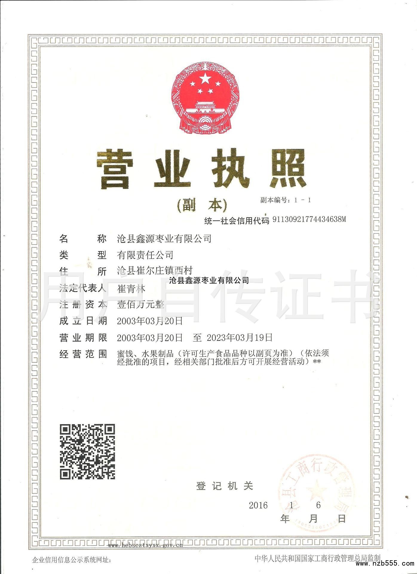 | 發(fā)證機(jī)構(gòu): | 滄縣工商行政管理局 | 發(fā)證時(shí)間 : | 2016-01-06 |