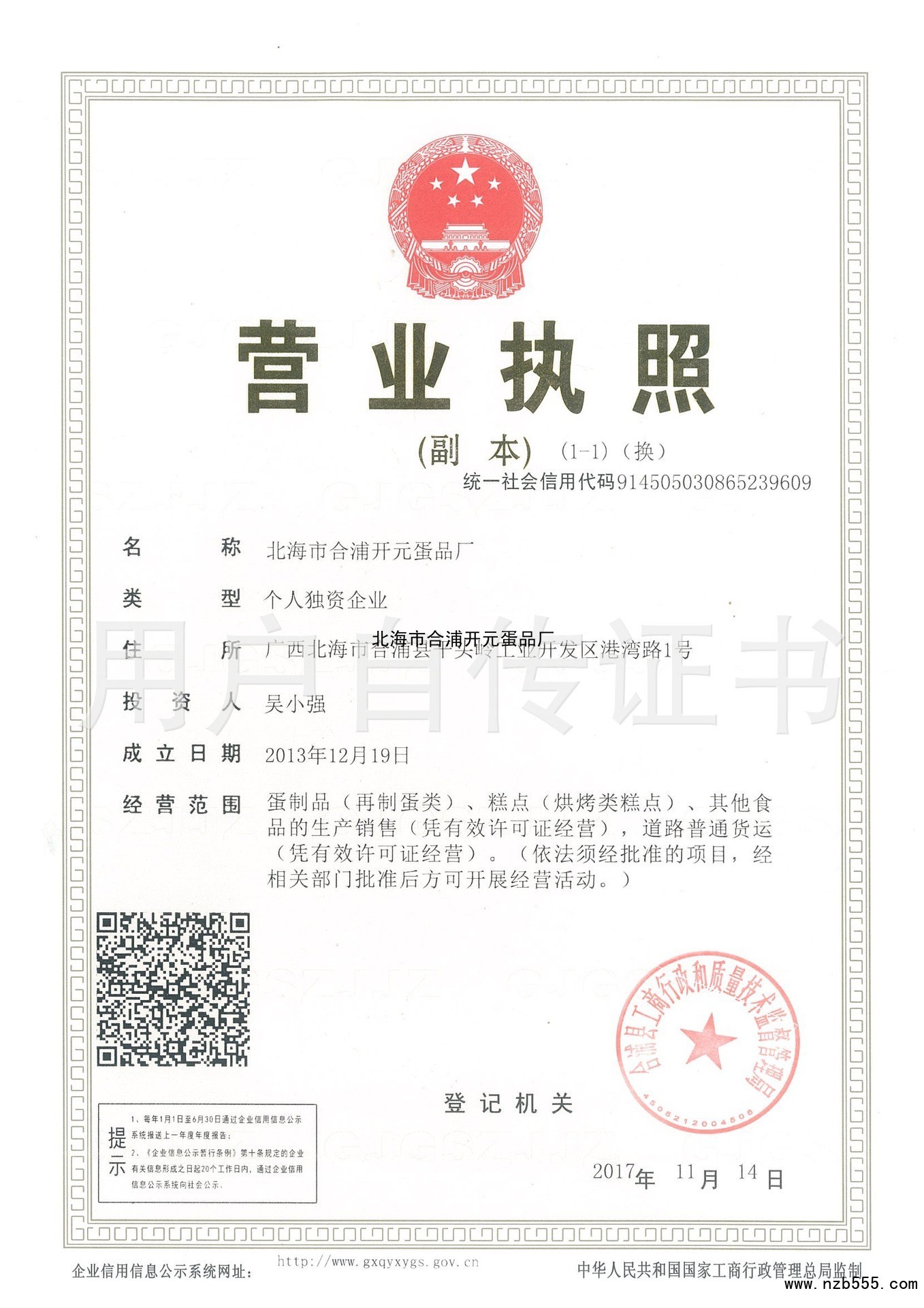 | 發(fā)證機(jī)構(gòu): | 合浦縣工商行政和質(zhì)量技術(shù)監(jiān)督管理局 | 發(fā)證時(shí)間 : | 2017-11-14 |