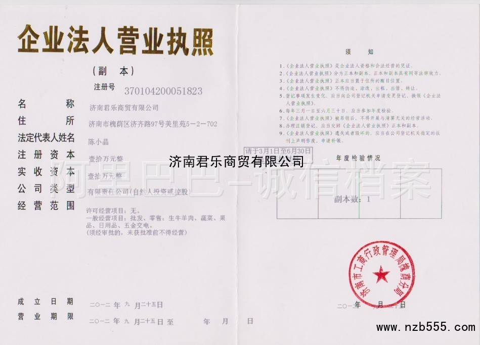 | 發(fā)證機(jī)構(gòu): | 濟(jì)南市工商行政管理局槐蔭分局 | 發(fā)證時(shí)間 : | 2012-09-25 |