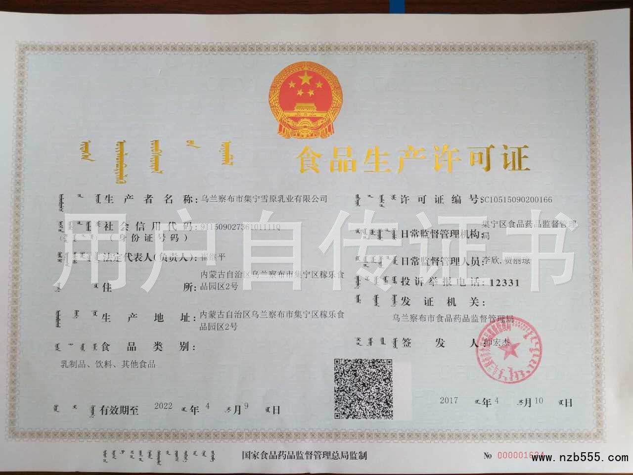 | 發(fā)證機(jī)構(gòu): | 烏蘭察布市食品藥品監(jiān)督管理局 | 發(fā)證時(shí)間 : | 2017-04-10 |