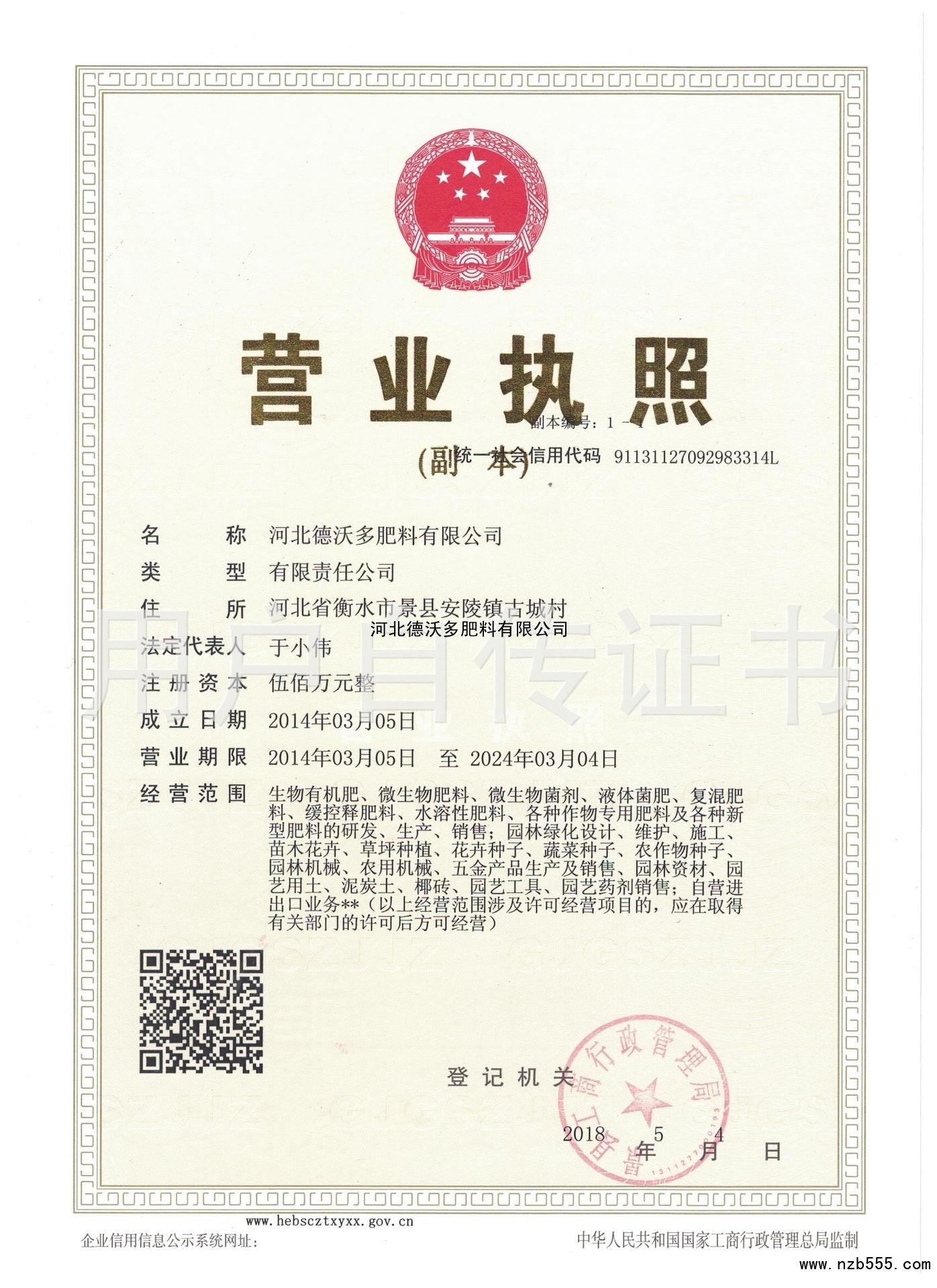 | 發(fā)證機(jī)構(gòu): | 景縣工商行政管理局 | 發(fā)證時(shí)間 : | 2018-05-04 |