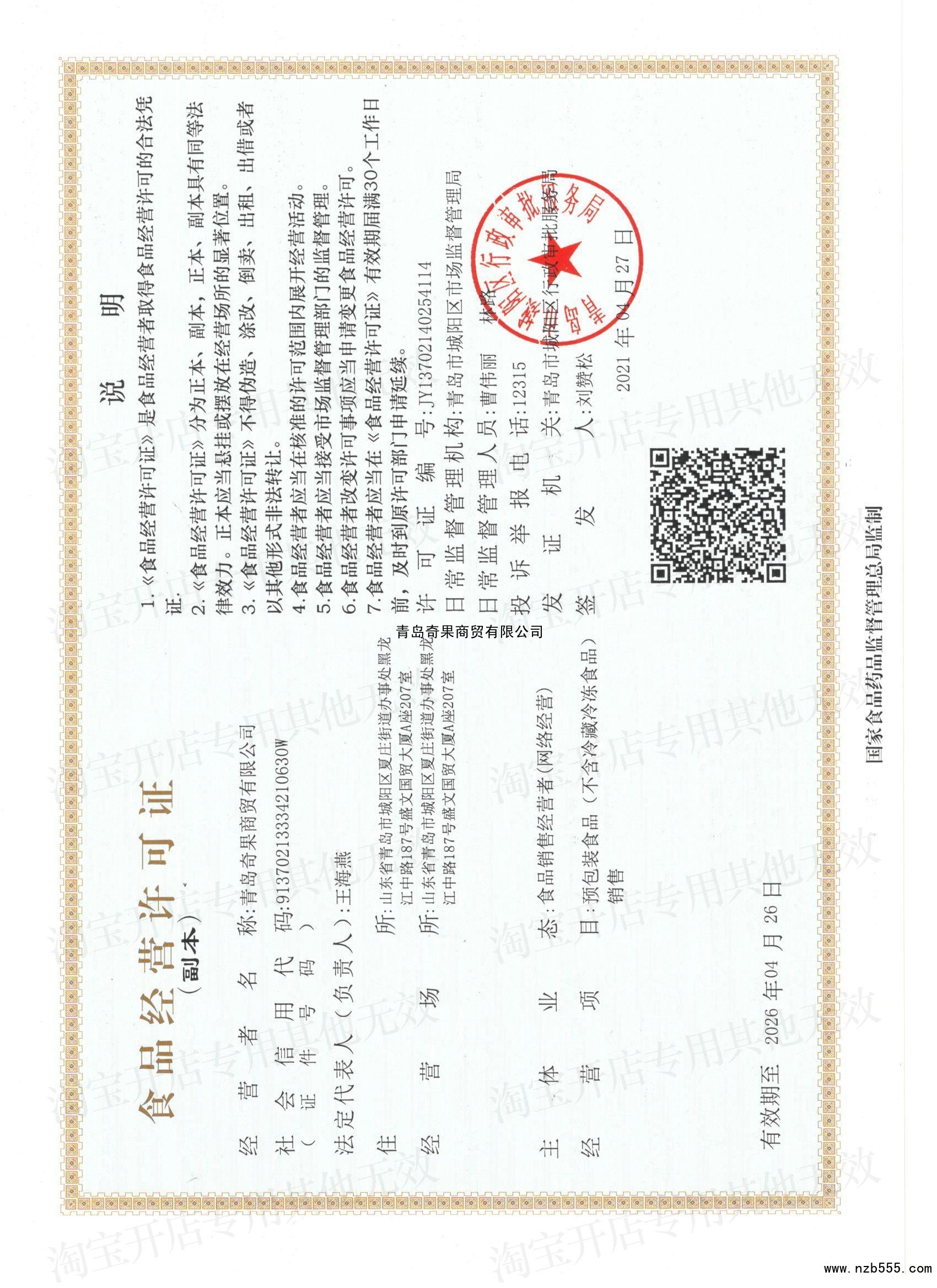 發(fā)證機(jī)構(gòu):   青島市城陽(yáng)區(qū)行政審批服務(wù)局 發(fā)證時(shí)間 :   2021-04-27