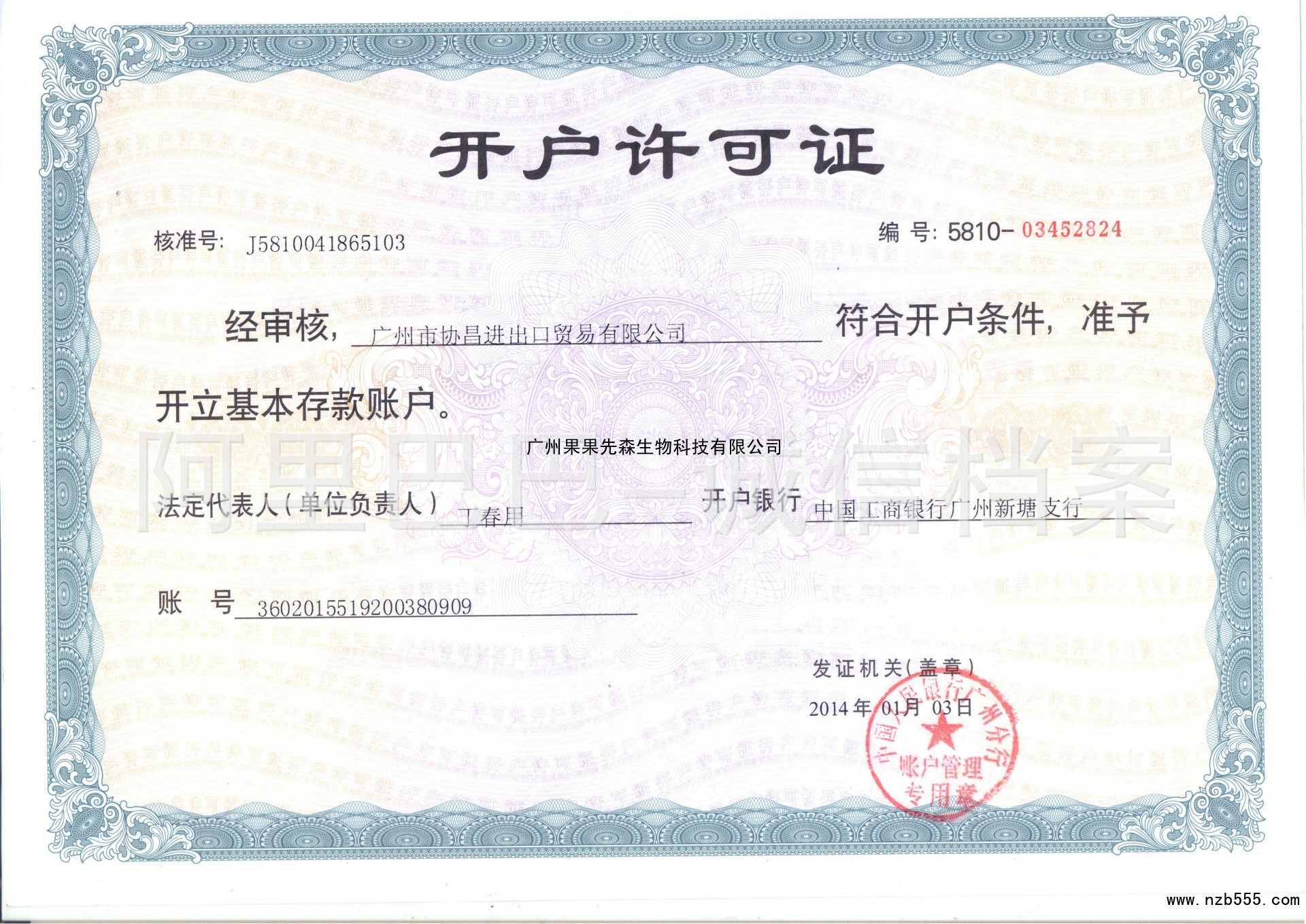 | 發(fā)證機(jī)構(gòu): | 中國(guó)工商銀行廣州新塘支行 | 發(fā)證時(shí)間 : | 2014-01-03 |