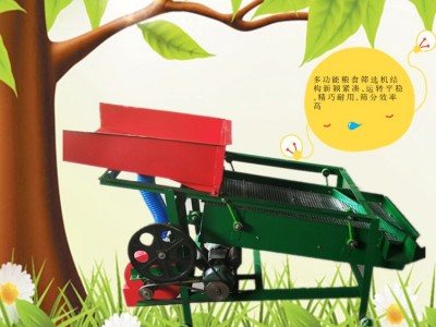 該精選篩為二層篩網,先經過進料口處風機抽風,直接抽走重量輕的雜葉或麥秸稈,上層篩的初次篩分再把大雜清理過,好的糧食(種子)直接落到下層篩網上,下層篩網會把糧食(種子)中的小雜.小石子.有缺陷的糧食(種子)直接漏掉,完好的糧食(種子)會從出料口篩分出來。該小型清糧機解決了揚場機的功能單一,不能有效去除石子.土塊的缺陷,更能為清理.凈選糧食(種子)帶來滿意的效果。該機有占地小,移動方便,便以維修,除塵除雜效率明顯,能耗低,使用簡便等優點。